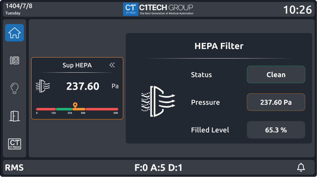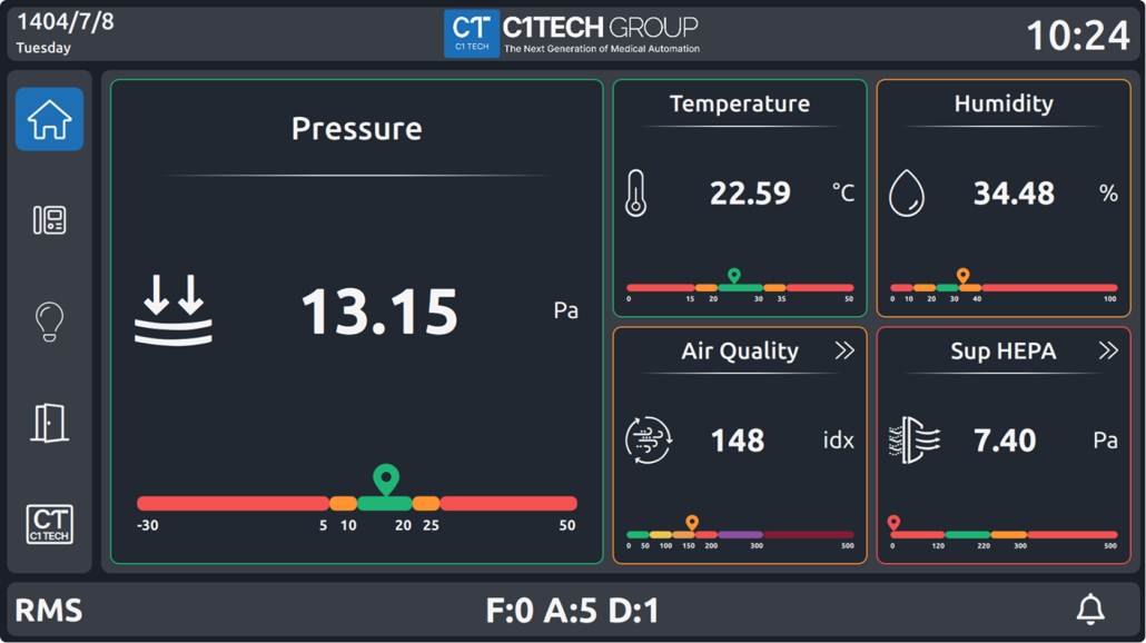 دستگاه مانیتورینگ محیطی C1Tech ویژهی کلینرومها طراحی شده و با بهرهگیری از فناوری پیشرفته، امکان پایش لحظهای و دقیق پارامترهای حیاتی از جمله دما، رطوبت، فشار، کیفیت هوا و وضعیت فیلترها را فراهم میکند. این سیستم با قابلیت پیکربندی بالا، کنترل کامل و متمرکز شرایط محیطی را در اختیار کاربر قرار میدهد.